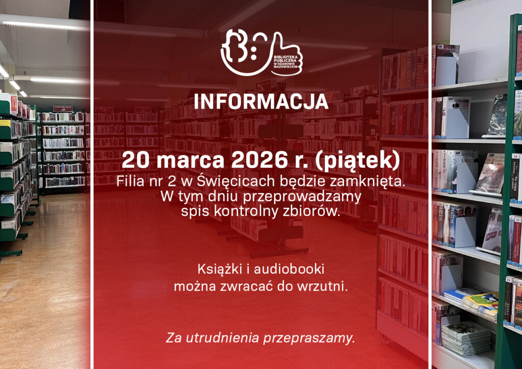 Uwaga skontrum! W dniach 20 kwietnia – 2 maja 2026 r. Biblioteka Główna w Ożarowie Mazowieckim będzie zamknięta. W tych dniach przeprowadzamy spis kontrolny zbiorów. Książki, filmy i audiobooki można …