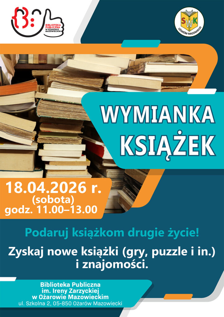W imieniu Sąsiedzkich Wymianek Książek – Ożarów Mazowiecki serdecznie zapraszamy na kolejną wymiankę książek. 18 kwietnia 2026 r. (sobota) 11:00 Biblioteka Publiczna im. Ireny Zarzyckiej w Ożarowie Mazowieckim, ul. Szkolna …