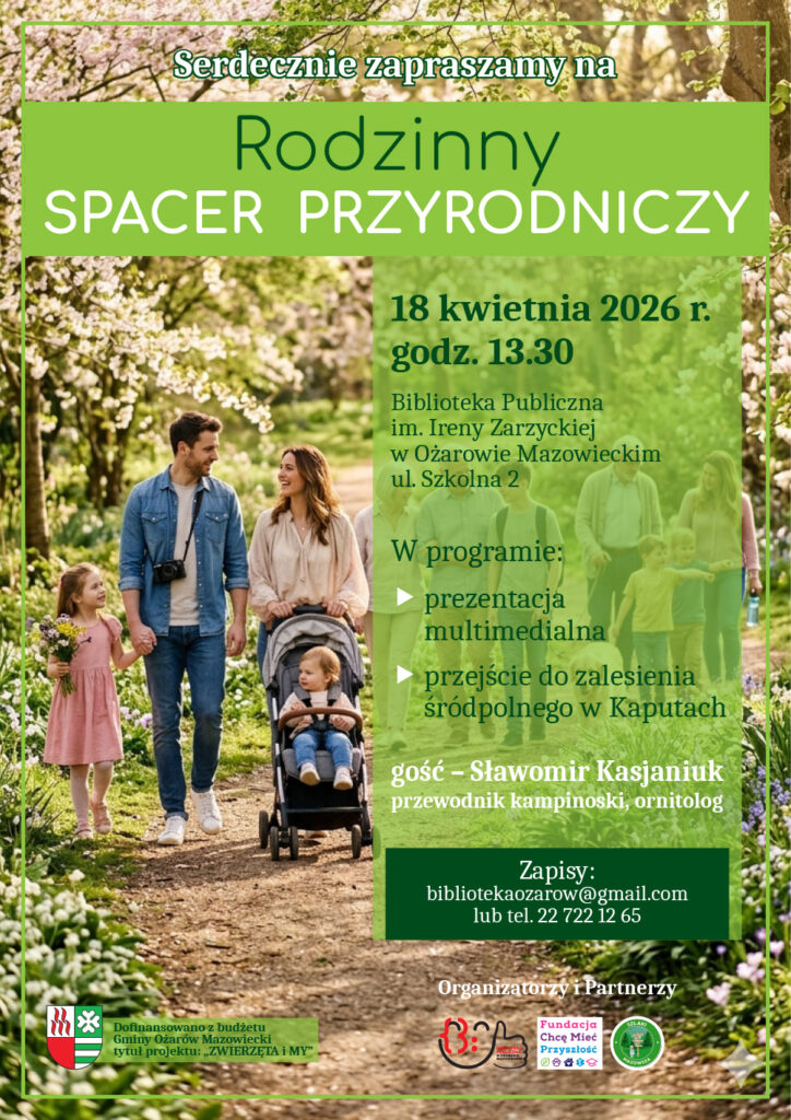 Wspólnie z Fundacją Chcę Mieć Przyszłość oraz Szlaki Mazowsza serdecznie zapraszamy na rodzinny spacer przyrodniczy. W programie: prezentacja multimedialna, przejście do zalesienia śródpolnego w Kaputach. Prelekcję poprowadzi Sławomir Kasjaniuk – ornitolog, przewodnik …