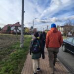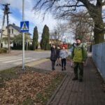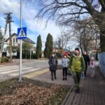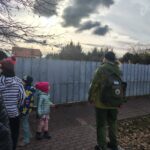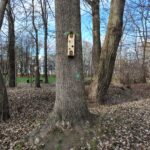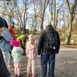 Następnie udaliśmy się na wspólny spacer do Parku Ołtarzewskiego. Po raz pierwszy wszyscy uczestnicy spaceru przyrodniczego szli do miejsca docelowego razem, rezygnując z samochodów i rowerów, dzięki czemu zyskaliśmy wiele nowych informacji. Idąc ulicą Dmowskiego obserwowaliśmy rośliny, pola i wyszukiwaliśmy wspólnie ptaki. Pan Sławomir objaśniał, jakie zwierzęta mogą znaleźć pożywienie na mijanych roślinach oraz identyfikował napotkane gniazda. Po dotarciu do parku, zatrzymaliśmy się na chwilę przy tablicy informacyjnej przedstawiającej ptaki występujące na terenie miasta. Przyrodnik krótko opowiedział o każdym z nich. W tym momencie nad naszymi głowami pojawił się niespodziewany gość – dzięcioł zielony, którego zdjęcia nie ma na tablicy. W parku wspólnie obserwowaliśmy ptaki, nasłuchiwaliśmy dźwięków i oglądaliśmy liczne budki lęgowe zawieszone na drzewach. Dowiedzieliśmy się, które z nich mogą być zamieszkane przez ptaki, które służą nietoperzom jako sypialnie, a w których bytują owady. Pod największą budką, przeznaczoną dla sów, znaleźliśmy nawet wypluwki puszczyka, co świadczy o jego częstej obecności w tym miejscu.