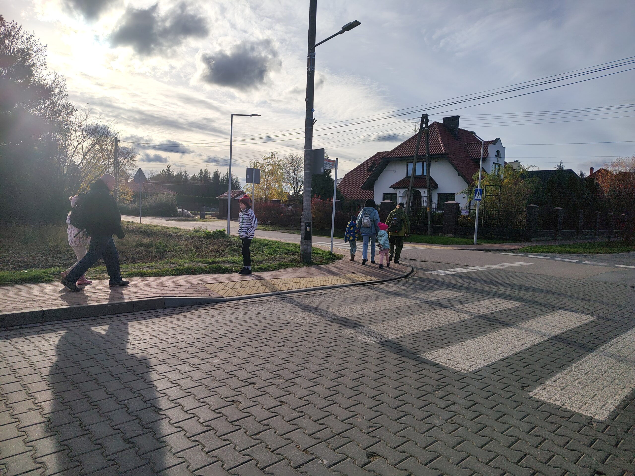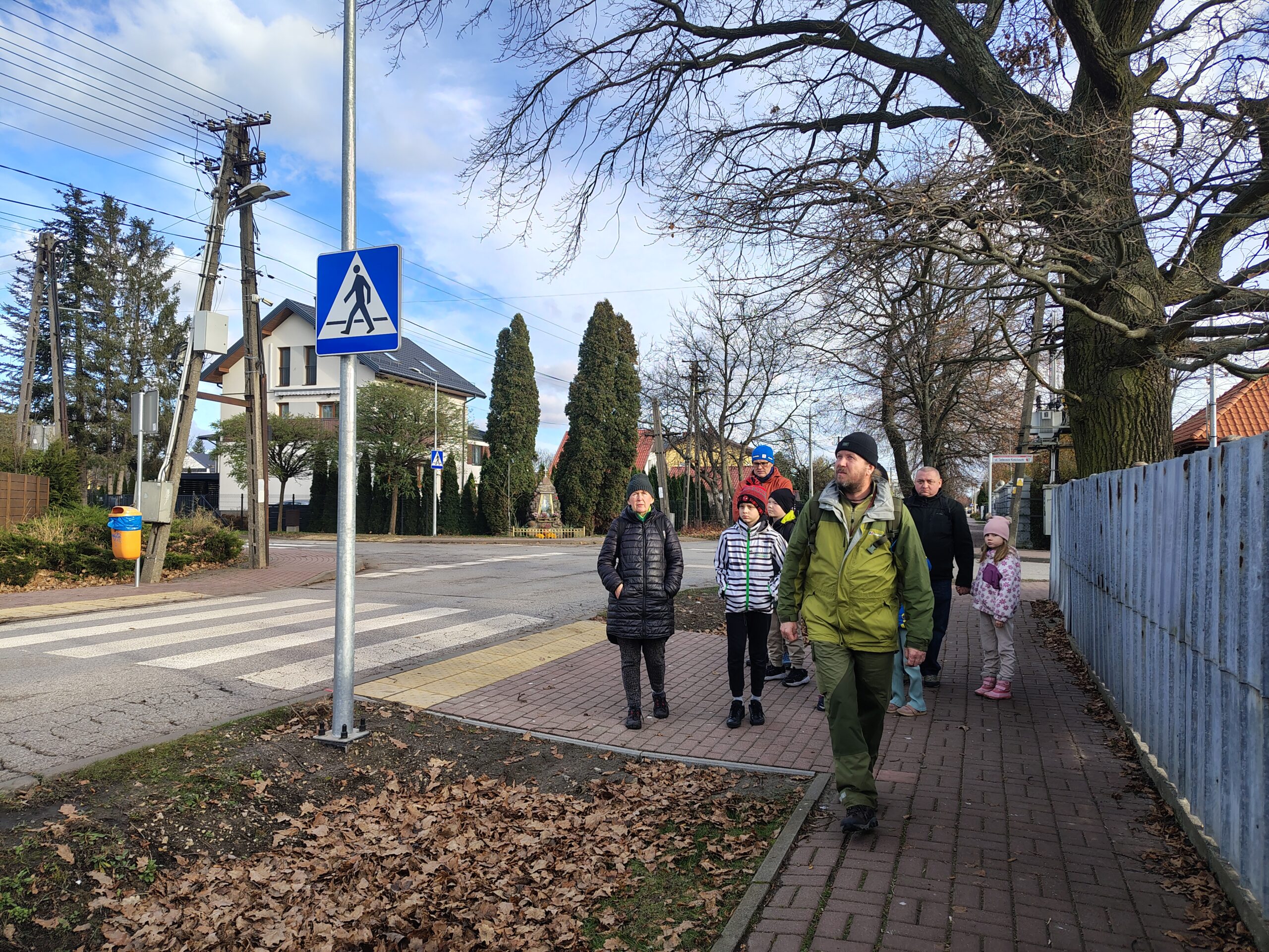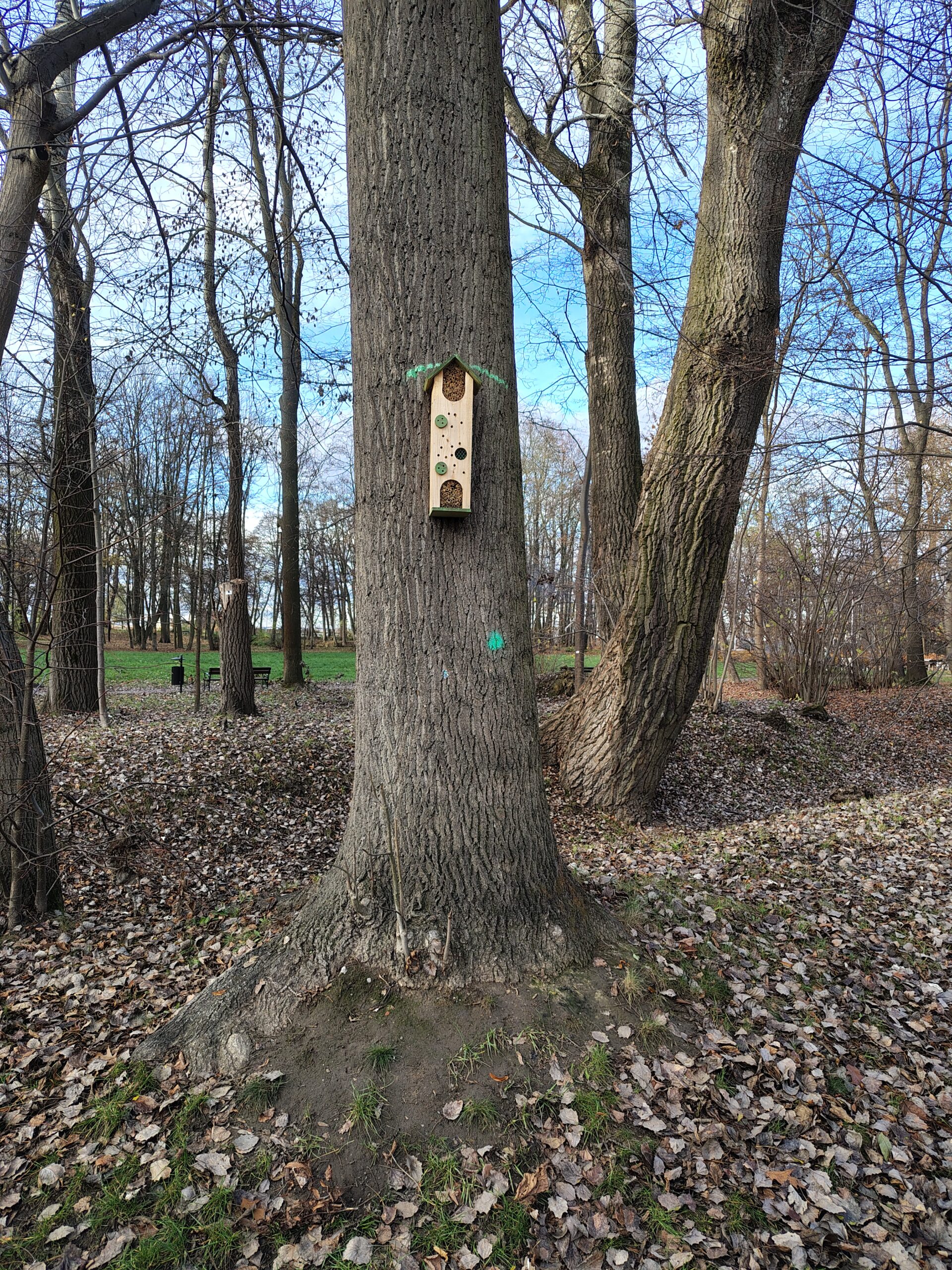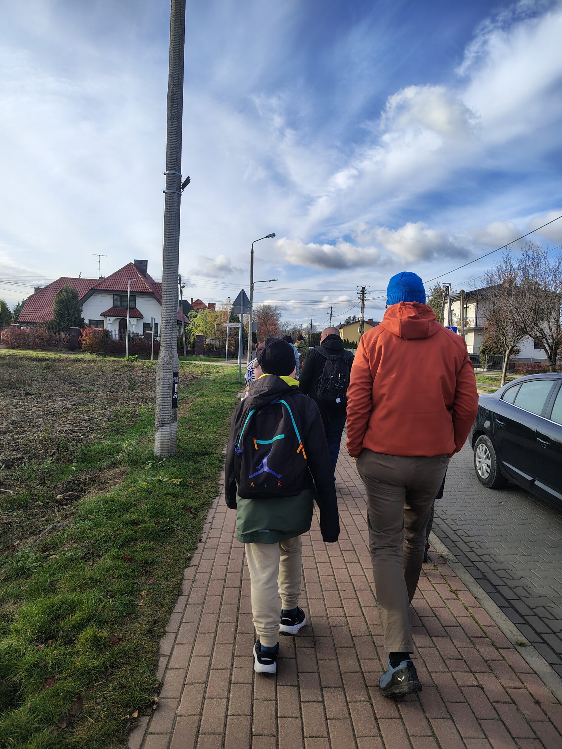 Następnie udaliśmy się na wspólny spacer do Parku Ołtarzewskiego. Po raz pierwszy wszyscy uczestnicy spaceru przyrodniczego szli do miejsca docelowego razem, rezygnując z samochodów i rowerów, dzięki czemu zyskaliśmy wiele nowych informacji. Idąc ulicą Dmowskiego obserwowaliśmy rośliny, pola i wyszukiwaliśmy wspólnie ptaki. Pan Sławomir objaśniał, jakie zwierzęta mogą znaleźć pożywienie na mijanych roślinach oraz identyfikował napotkane gniazda. Po dotarciu do parku, zatrzymaliśmy się na chwilę przy tablicy informacyjnej przedstawiającej ptaki występujące na terenie miasta. Przyrodnik krótko opowiedział o każdym z nich. W tym momencie nad naszymi głowami pojawił się niespodziewany gość – dzięcioł zielony, którego zdjęcia nie ma na tablicy. W parku wspólnie obserwowaliśmy ptaki, nasłuchiwaliśmy dźwięków i oglądaliśmy liczne budki lęgowe zawieszone na drzewach. Dowiedzieliśmy się, które z nich mogą być zamieszkane przez ptaki, które służą nietoperzom jako sypialnie, a w których bytują owady. Pod największą budką, przeznaczoną dla sów, znaleźliśmy nawet wypluwki puszczyka, co świadczy o jego częstej obecności w tym miejscu.