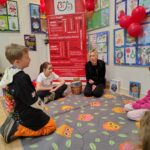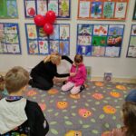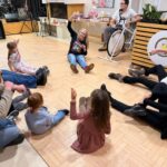 W części warsztatowej dzieci przy pomocy rodziców, budowały własne modele Robomira. Roboty te miały za zadanie „sprawdzać”, czy trafiające do ich zakładów pokarmy są zdrowe – a my w ten sposób promowaliśmy m.in. jedzenie warzyw i owoców. Całość zakończyła się wspólnym tańcem radości, który pokazał, że zdrowe brzuszki to zdrowe ciało, a w zdrowym ciele jest energia do ruchu w każdej formie. Dlatego nasz taniec nie był zwykłym tańcem. Zatańczyliśmy go na stojąco, na siedząco, a nawet na leżąco 😊