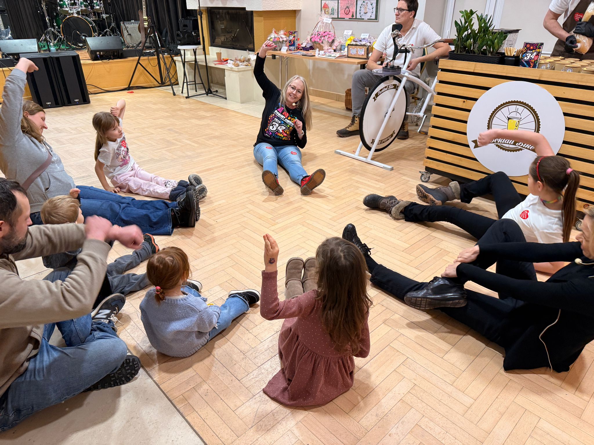 W części warsztatowej dzieci przy pomocy rodziców, budowały własne modele Robomira. Roboty te miały za zadanie „sprawdzać”, czy trafiające do ich zakładów pokarmy są zdrowe – a my w ten sposób promowaliśmy m.in. jedzenie warzyw i owoców. Całość zakończyła się wspólnym tańcem radości, który pokazał, że zdrowe brzuszki to zdrowe ciało, a w zdrowym ciele jest energia do ruchu w każdej formie. Dlatego nasz taniec nie był zwykłym tańcem. Zatańczyliśmy go na stojąco, na siedząco, a nawet na leżąco 😊