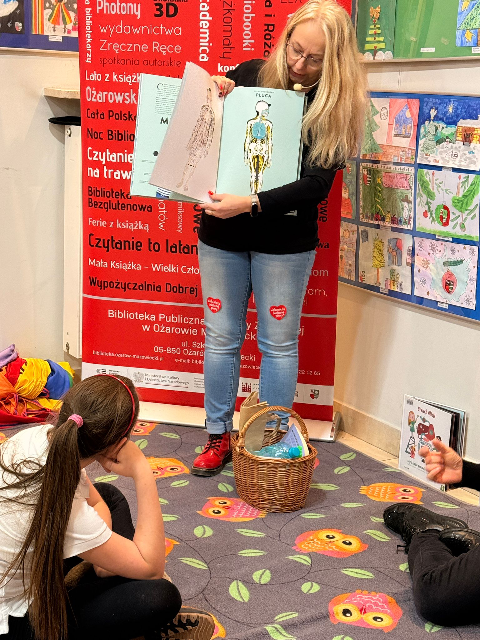 Rozpoczęliśmy je od krótkiego sprawdzianu dla dzieci i rodziców, co można wrzucić do brzuszka, aby był zdrowy i zadowolony. Wykorzystana do zabawy kolorowa chusta animacyjna dała nam dużo radości i energii do dalszych działań. Następnie, w oparciu o książkę Adama Mirka pt. „Bebechy, czyli ciało człowieka pod lupą”, uczestnicy zgłębiali tajemnice ludzkiego organizmu. Duże zainteresowanie wzbudziły ciekawostki o funkcjonowaniu przełyku, żołądka i wątroby oraz informacja o dobowej produkcji śliny. Aby lepiej zobrazować anatomię człowieka, użyliśmy specjalnej linki, za pomocą której odmierzaliśmy długość układu pokarmowego dziecka i dorosłego. Kolejnym etapem była literacka podróż z robotem Robomirem, bohaterem książki Eweliny Garbuli „Robofabryka. Zakład pokarmowy”. Podczas wycieczki do tego niezwykłego zakładu uczestnicy dowiedzieli się m.in. jak działają zęby i jakie rodeo przy każdym jedzeniu musi wykonać język.