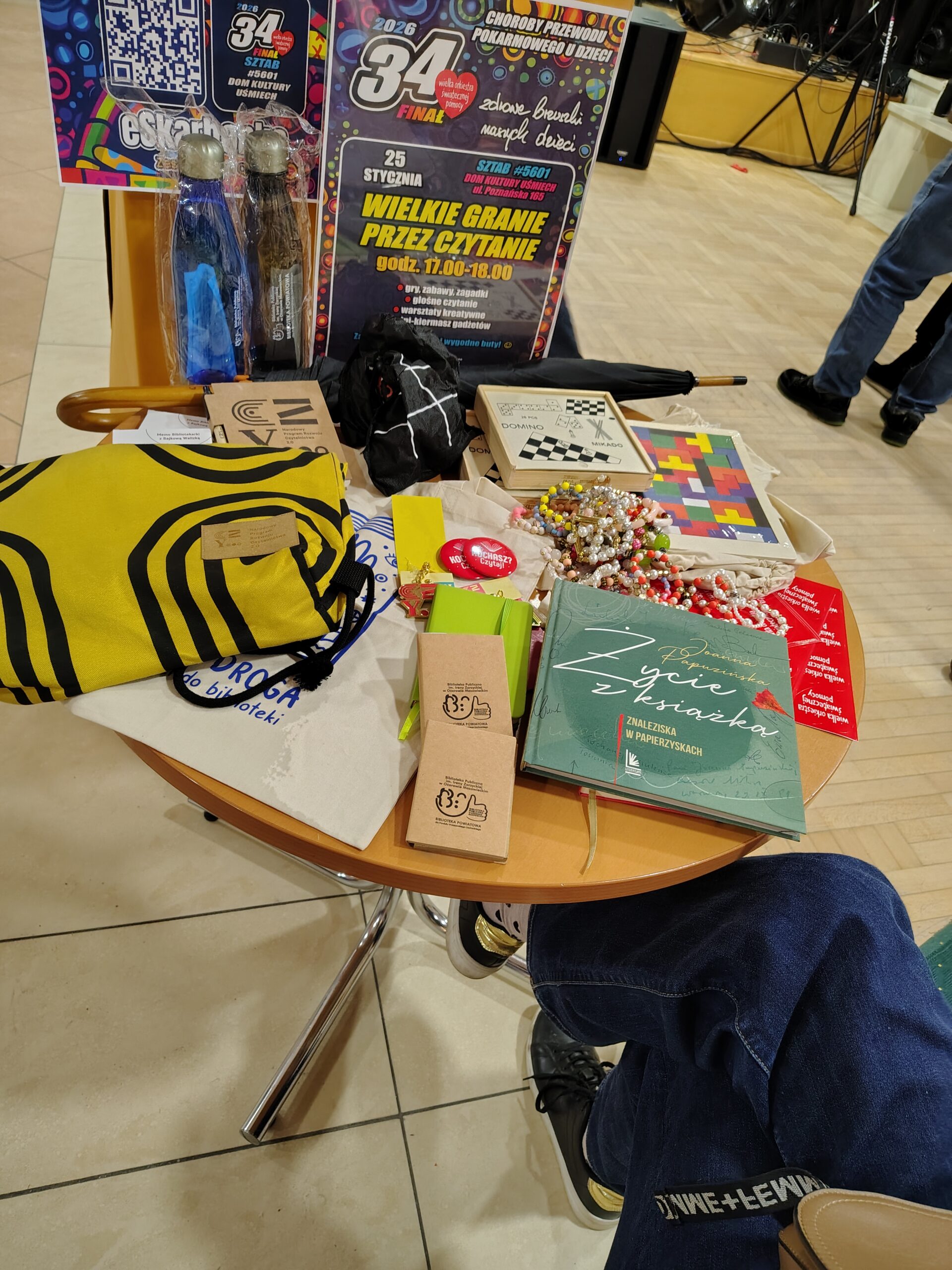 Kwesta rozpoczęła się już w grudniu, kiedy w Bibliotece Głównej oraz Filiach w Józefowie i Święcicach stanęły puszki stacjonarne. Dzięki hojności Czytelników udało się zebrać kwotę 531 zł i 23 gr. A w dniu 34. Finału tradycyjnie pomagaliśmy w Sztabie w liczeniu pieniędzy z puszek wolontariuszy i przygotowaliśmy mini-kiermasz gadżetów oraz biżuterii wykonanej przez Klub Pasjonatów w Józefowie. Jednak najważniejszą częścią naszej aktywności było rodzinne spotkanie pn. „Wielkie Granie Przez Czytanie”.