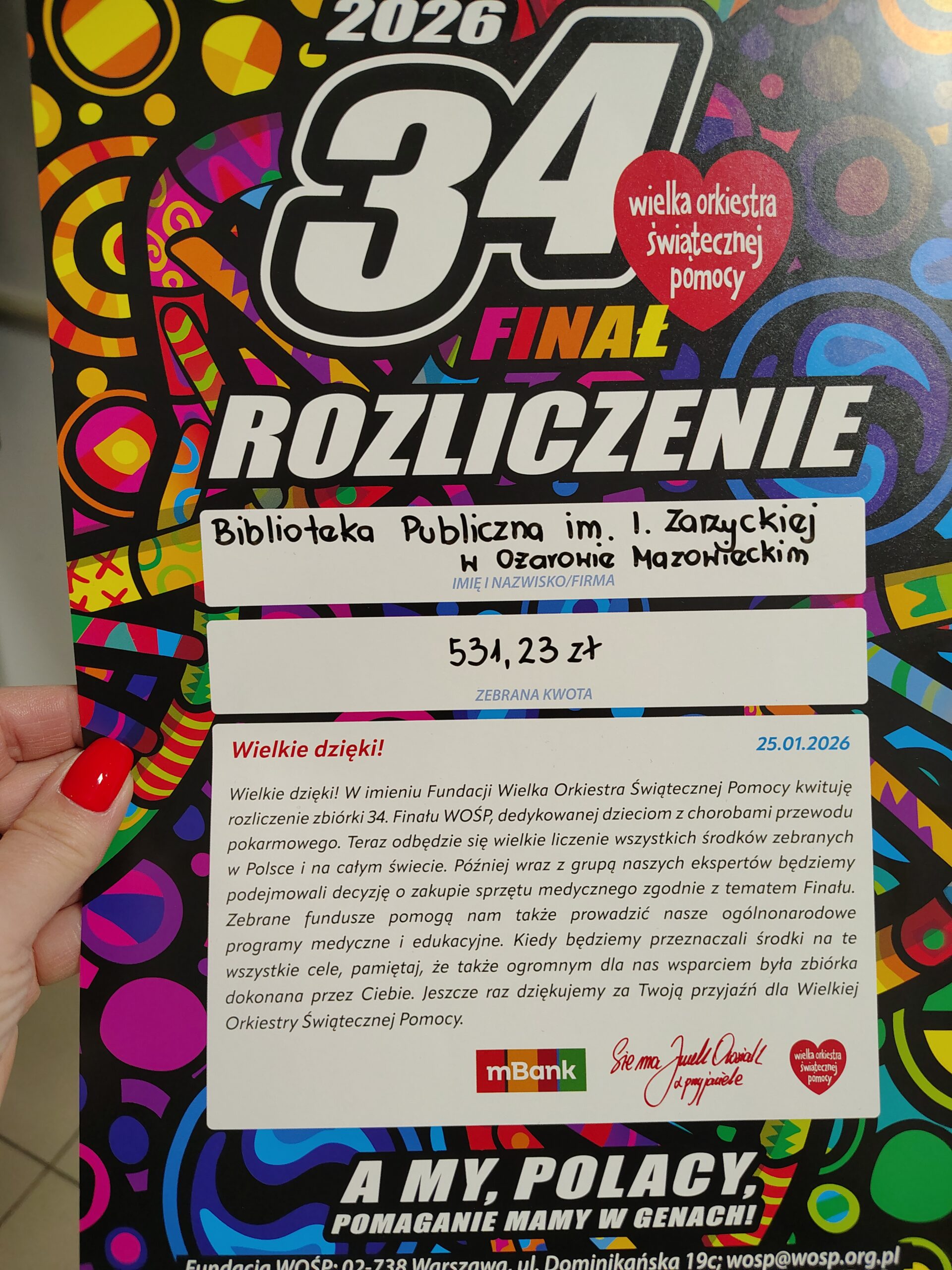25 stycznia 2026 roku Biblioteka Publiczna im. Ireny Zarzyckiej w Ożarowie Mazowieckim po raz kolejny aktywnie włączyła się w zbiórkę Wielkiej Orkiestry Świątecznej Pomocy. Dołączyliśmy do Sztabu nr 5601 w Domu Kultury „Uśmiech” i zagraliśmy dla „Zdrowych brzuszków naszych dzieci”.