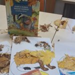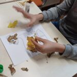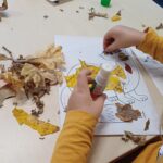 Kolejną historią, którą odkryliśmy podczas trwania cyklu były fragmenty książki „Jesień w Klinice Małych Zwierząt w Leśnej Górce” Tomasza Szweda. Sylwetkę jednej z występujących tam postaci – wspaniałej doktor Łasiczki – tworzyliśmy wyklejając jesienne liście na papierze.