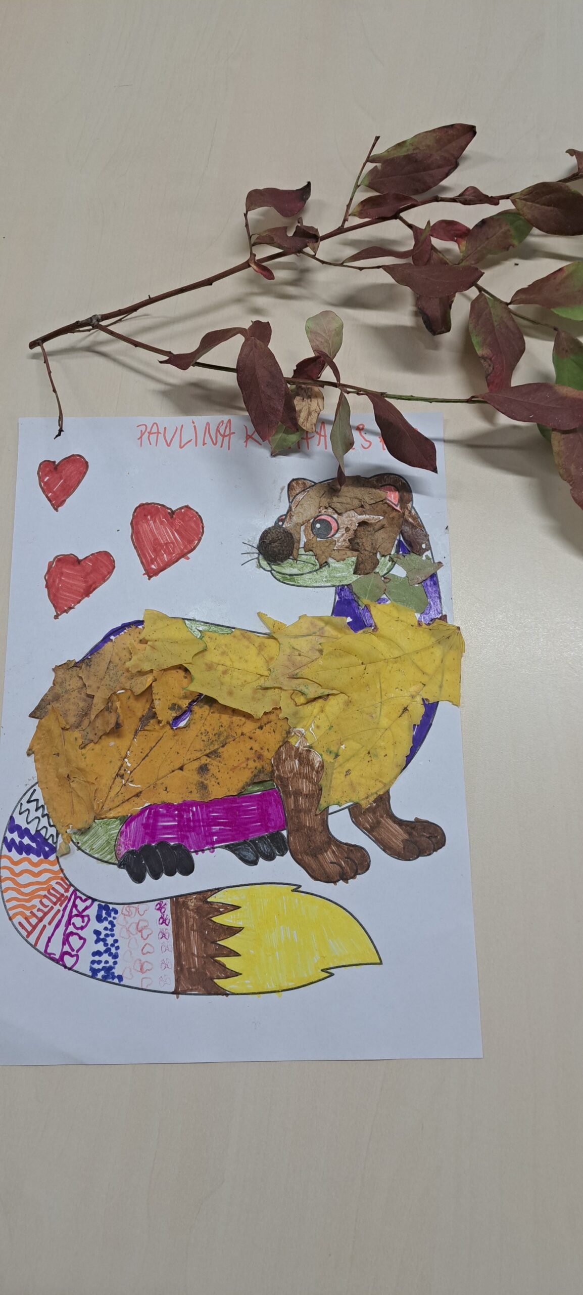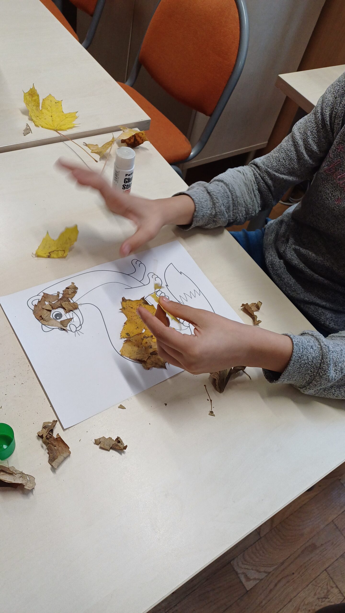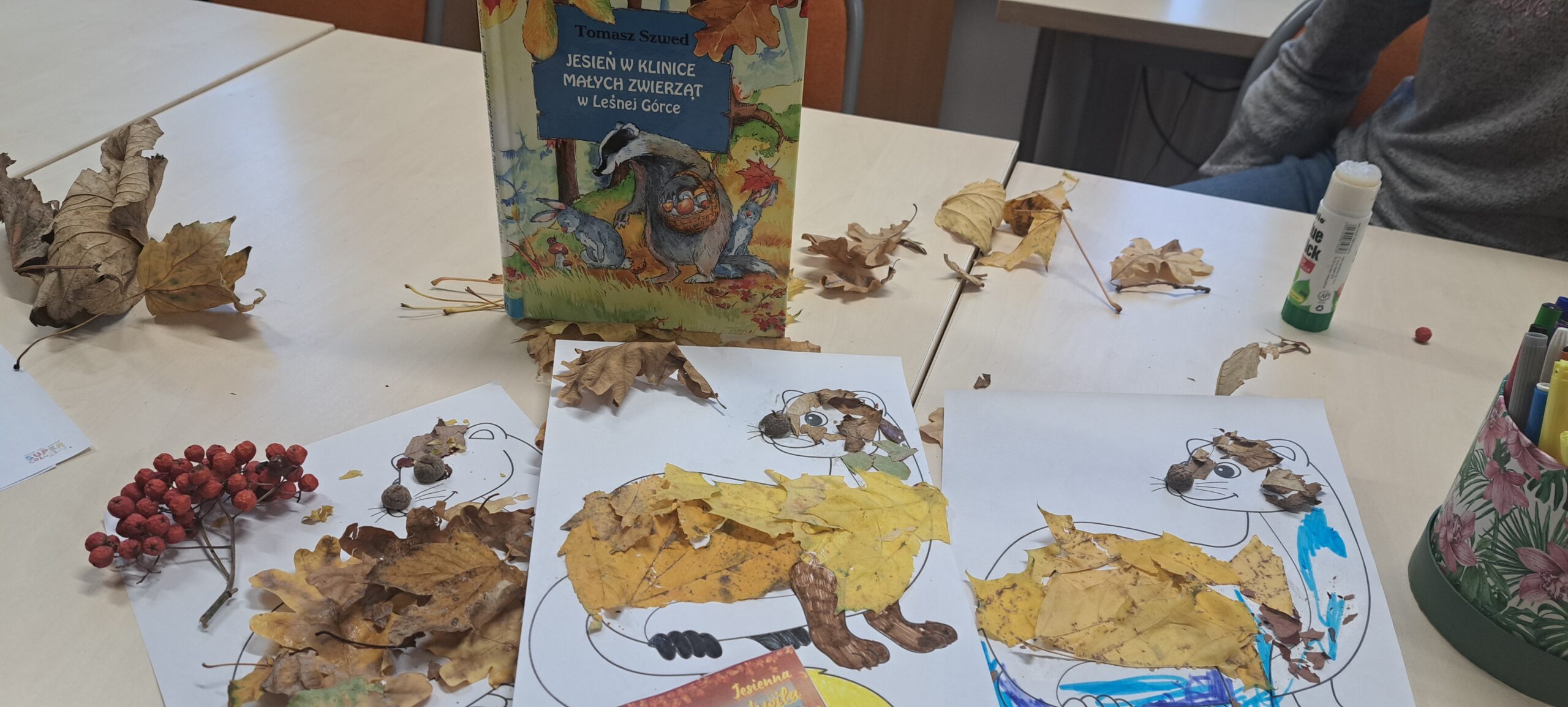 Kolejną historią, którą odkryliśmy podczas trwania cyklu były fragmenty książki „Jesień w Klinice Małych Zwierząt w Leśnej Górce” Tomasza Szweda. Sylwetkę jednej z występujących tam postaci – wspaniałej doktor Łasiczki – tworzyliśmy wyklejając jesienne liście na papierze.