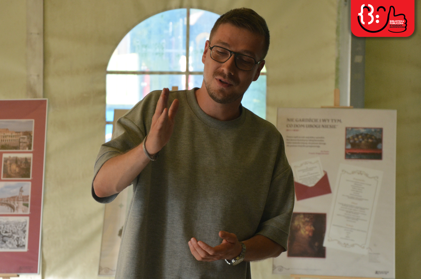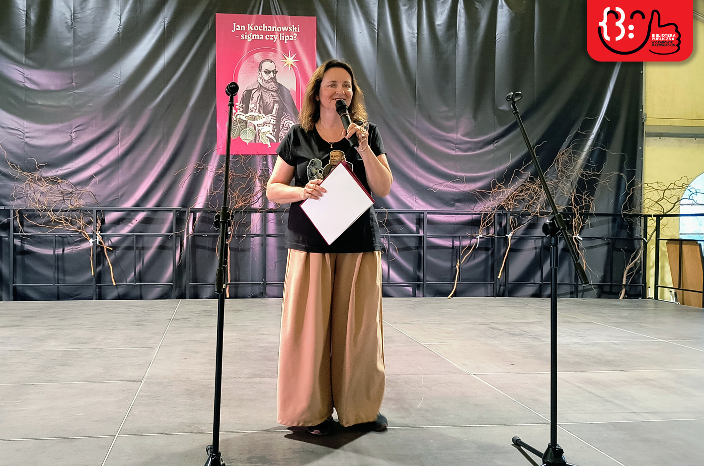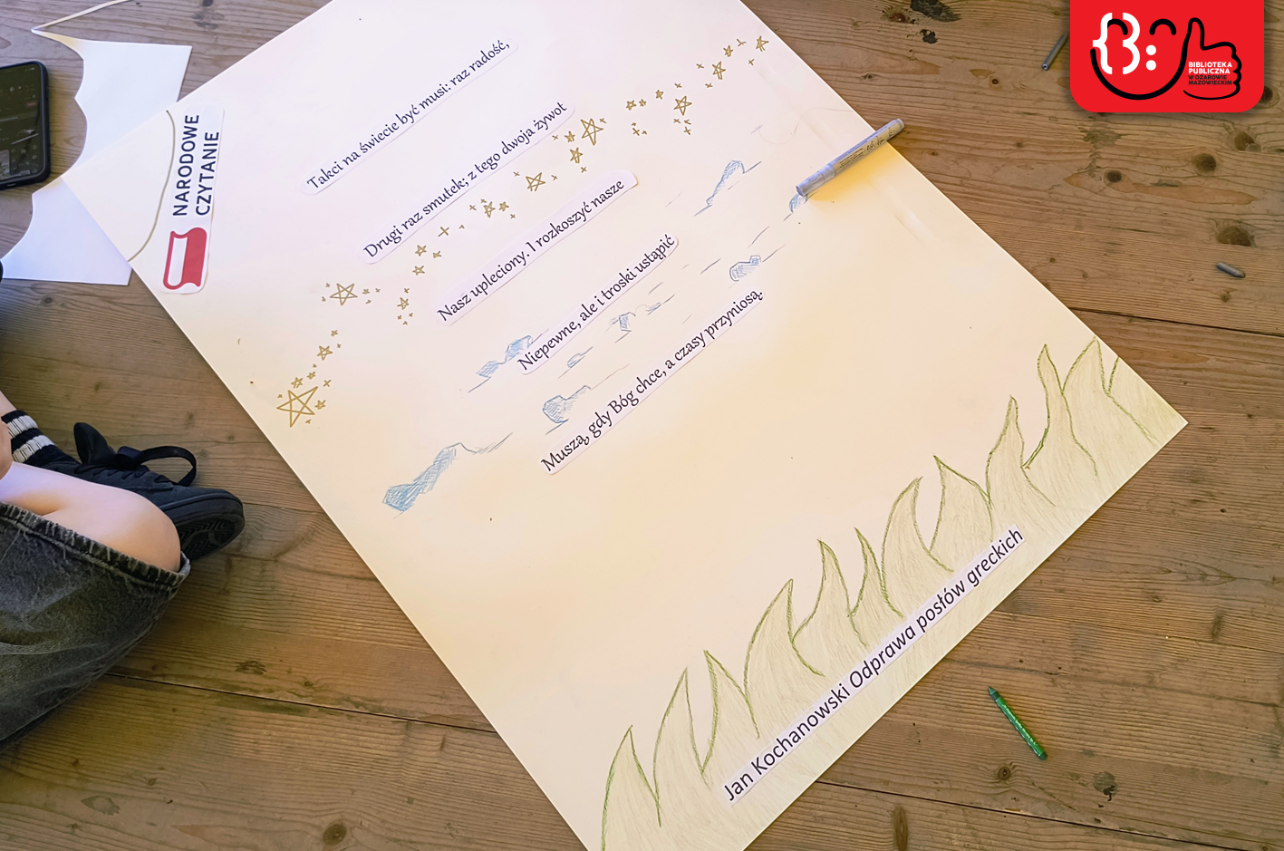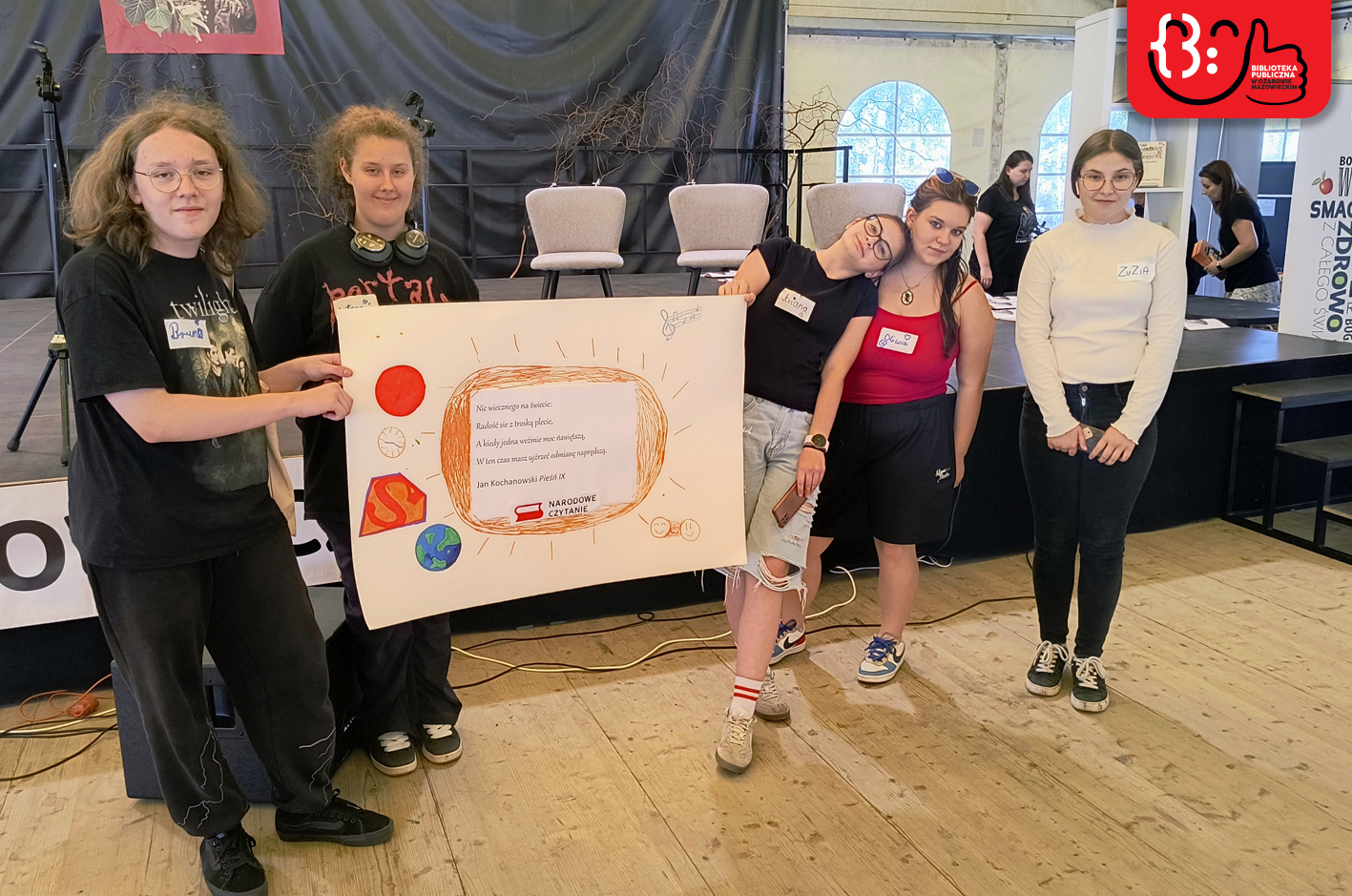 Wydarzenie rozpoczęło się od ciekawego akcentu wizualnego i edukacyjnego. Młodzież ze Szkoły Podstawowej nr 1 im. Janusza Kusocińskiego, pod opieką pań Niny Gruber, Emilii Bartosik, Danuty Załuskiej i Danuty Jabczyńskiej, w ramach wolontariatu stworzyła bogato ilustrowane plakaty z cytatami z fraszek, pieśni oraz „Odprawy posłów greckich”. Te artystyczne prace ozdobiły przestrzeń hali, wprowadzając renesansowy, ale też młodzieżowy klimat. Nie była to jednak jedyna tego dnia wystawa – Narodowemu Czytaniu towarzyszyła bowiem ekspozycja „Jan Kochanowski – Sigma czy Lipa?”, użyczona naszej Bibliotece przez Książnicę Płocką im Władysława Broniewskiego. Dzięki obu wystawom uczestnicy wydarzenia poznali nie tylko osobę renesansowego poety, ale też jego twórczość i czas, w jakim przyszło mu żyć i tworzyć.