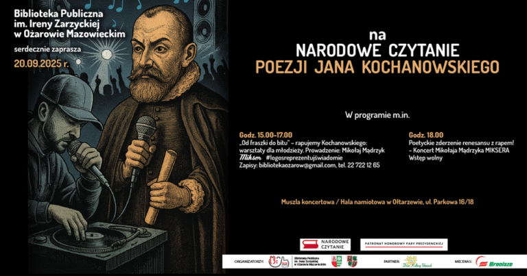 20 września 2025 roku, Biblioteka Publiczna im. Ireny Zarzyckiej zorganizowała 12 edycję lokalnego Narodowego Czytania, nawiązując do 14 już odsłony akcji pod patronatem Pary Prezydenckiej, która w całym kraju odbyła się 6 września. Tym razem motywem przewodnim była twórczość Jana Kochanowskiego, a wydarzenie przeniosło się do hali namiotowej w Ołtarzewie. Tradycji stało się zadość, choć zupełnie inaczej niż dotychczas…