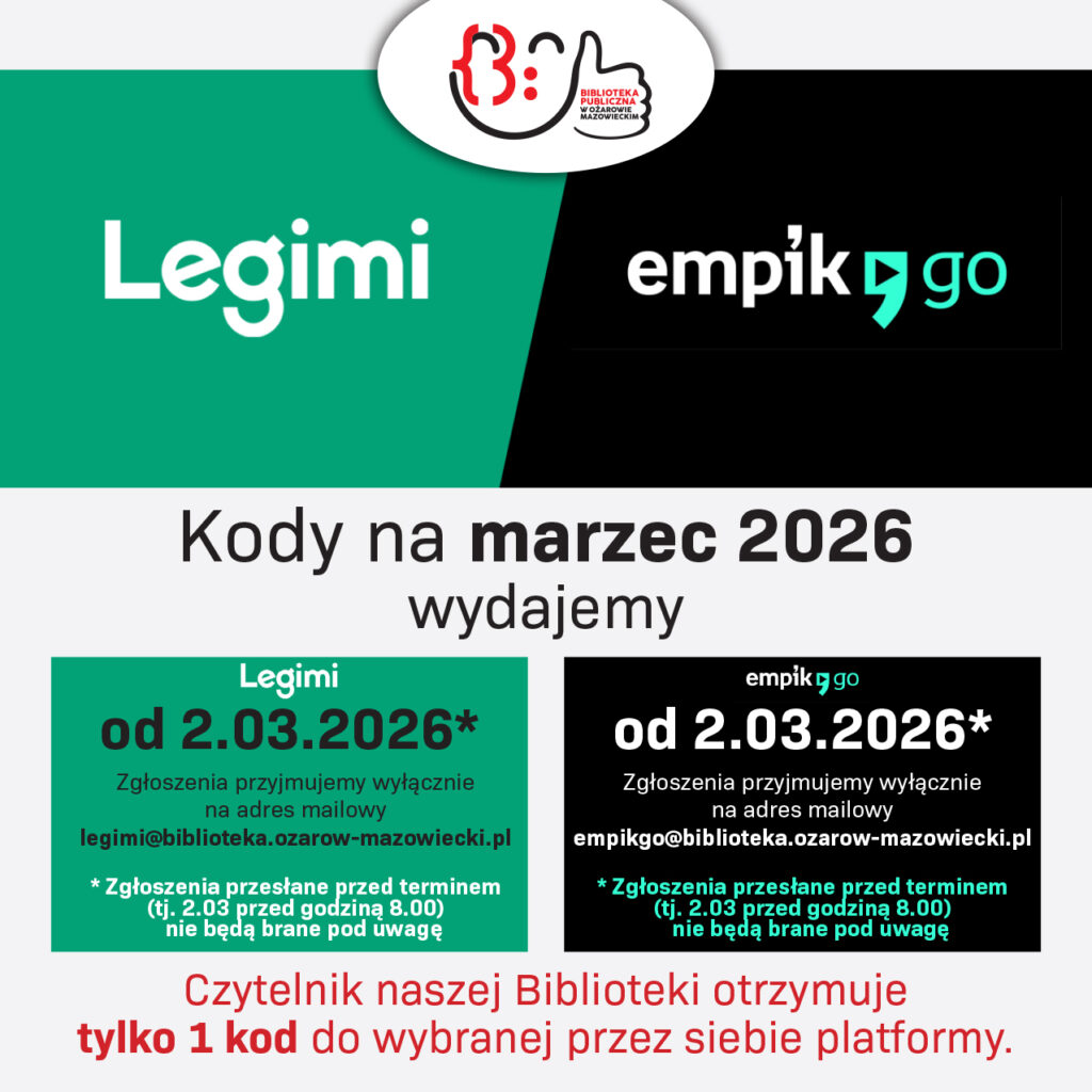 Nowa pula kodów Legimi oraz Empik Go dostępna będzie od poniedziałku, 2 marca. Zgłoszenia należy kierować 2 marca, od godziny 8.00, wyłącznie na adresy:legimi@biblioteka.ozarow-mazowiecki.pl lub empikgo@biblioteka.ozarow-mazowiecki.pl. Uwaga! Liczba kodów ograniczona. Oferta skierowana do …