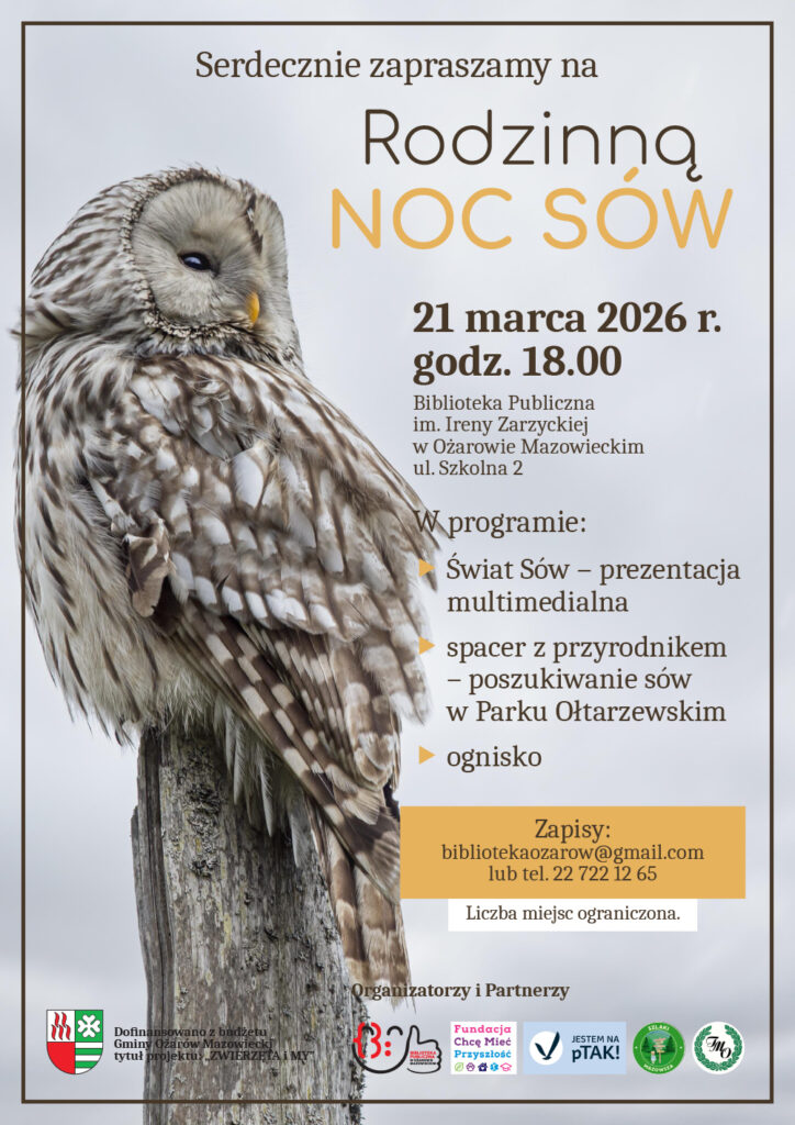 Wspólnie z Fundacją Chcę Mieć Przyszłość, Stowarzyszeniem Jestem na pTAK!, Szlakami Mazowsza oraz Towarzystwem Miłośników Ołtarzewa serdecznie zapraszamy na Rodzinną Noc Sów. W programie: Świat Sów – prezentacja multimedialna,spacer z …
