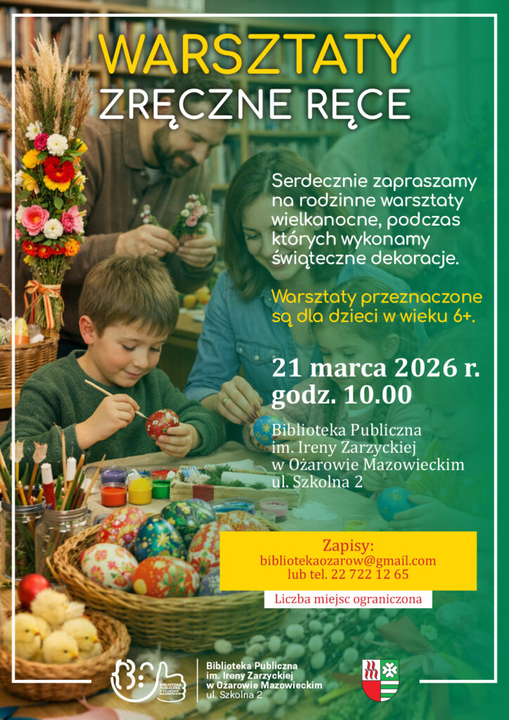 Serdecznie zapraszamy na rodzinne warsztaty wielkanocne Zręczne ręce. Tym razem wspólnie przygotujemy świąteczne dekoracje. Warsztaty przeznaczone dla dzieci w wieku 6+. 21 marca 2026 r. (sobota) 10.00 Biblioteka Publiczna …